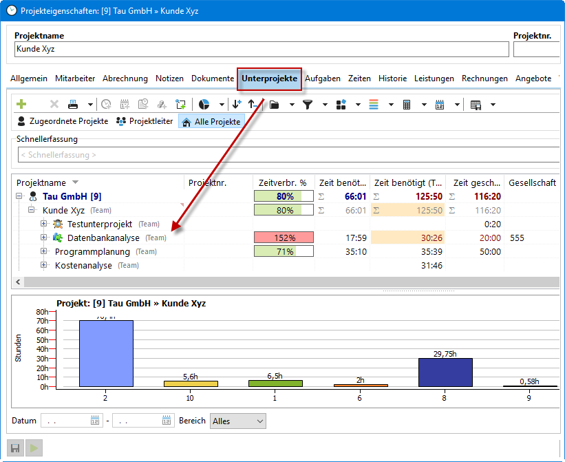 Im Reiter "Unterprojekte" sehen Sie die Liste der Unterprojekte zum Hauptprojekt. In der Auflistung können Sie mit der rechten Maustaste auf ein Projekt klicken und über das Kontextmenü weitere Projekte hinzufügen oder ein bestehendes Projekt bearbeiten. Per Klick auf die Spaltenüberschriften können Sie Spalten ein- bzw. ausblenden und entsprechend drucken.