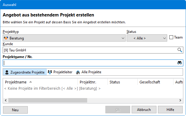 Möchten Sie ein Angebot aus einem bestehenden Projekt erstellen, können Sie im Reiter "Angebote" auch direkt auf  und dann auf die Auswahl "Neu aus Projekt" gehen. Wählen Sie im entsprechenden Suchfeld ein Projekt aus, auf dessen Basis Sie ein Angebot erstellen möchten.