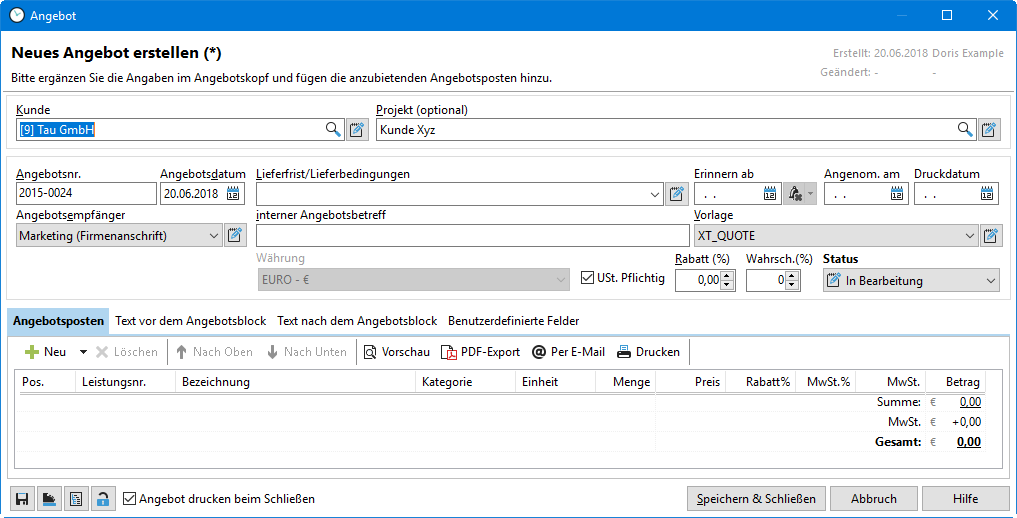 Mit der Auswahl "Neues Angebot" ergänzen Sie dann im entsprechenden Dialogfenster die Angaben im Angebotskopf und fügen die anzubietenden Angebotsposten im Reiter "Angebotsposten" durch Klicken auf das Symbol hinzu.