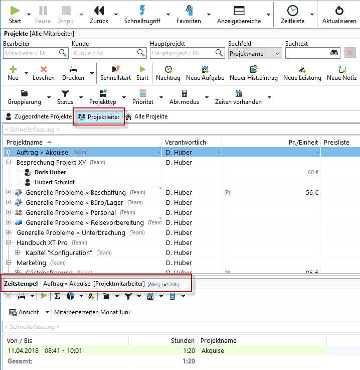 Als Ergebnis sehen Sie eine Liste aller Kunden mit Projekten, bei denen der Mitarbeiter als Projektleiter gesetzt ist.