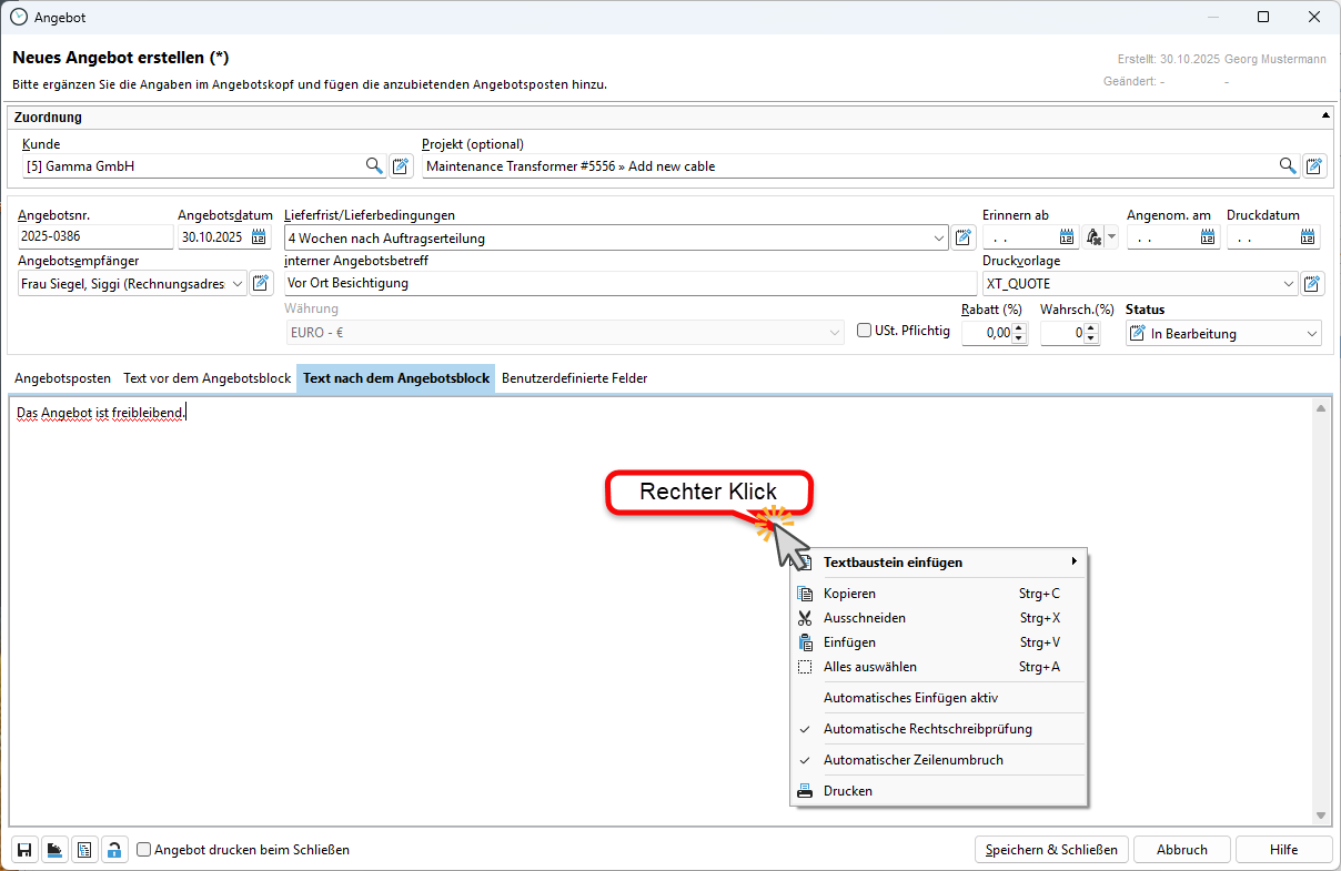 Auf Ihrem Angebot können Sie auch nach der Auflistung Ihrer Angebotspositionen noch einen freien Text pro Angebot einfügen. Hier können Sie auch von Ihnen definierte Textbausteine nutzen.