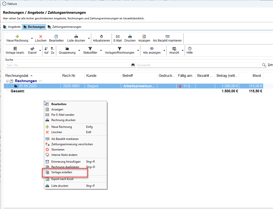Erstellen Sie eine neue Rechnungsvorlage, indem Sie im Bereich der Rechnungsliste einen Rechtsklick machen.