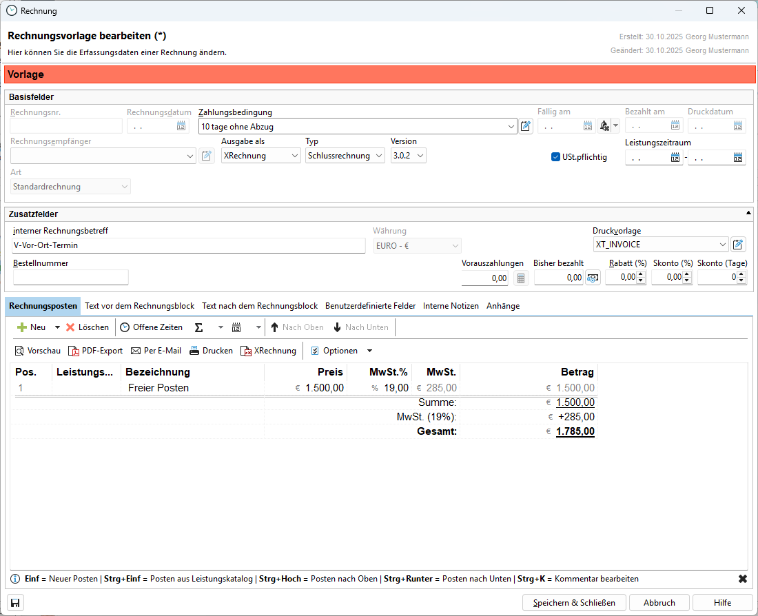 Ab sofort können Sie eine neue Rechnung auf Basis dieser Vorlage erstellen.