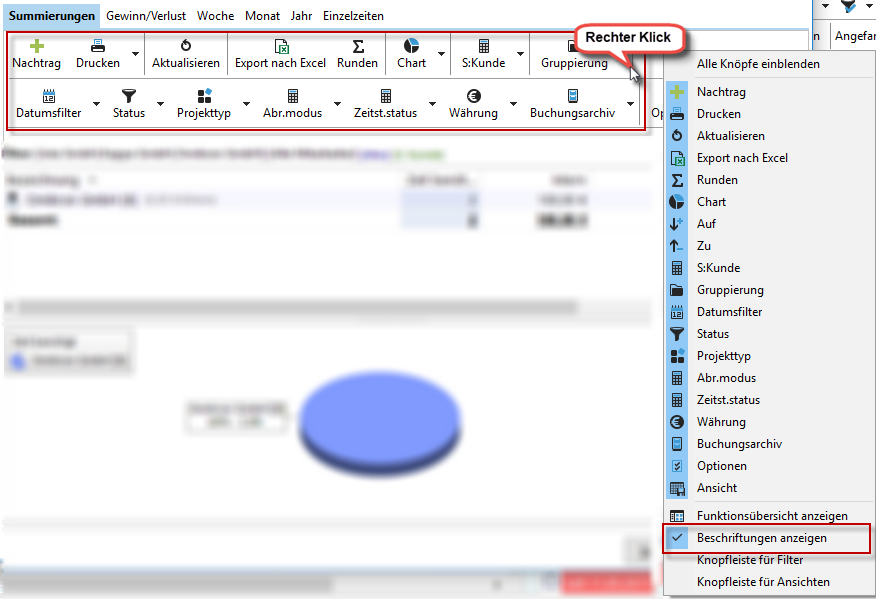 Per Rechtsklick auf die Symbolleiste Ihrer Auswertung können Sie die einzelnen Zeilen der Knöpfe zu einer Zeile zusammenfügen. Auch die Beschriftungen können Sie ein- bzw. ausblenden.
