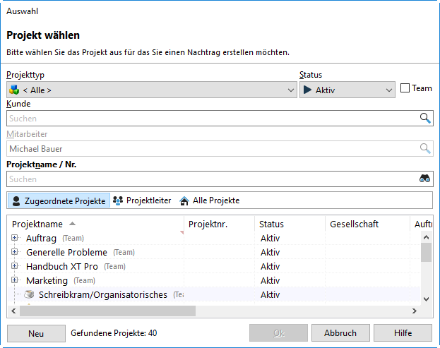 Programmweit finden Sie diesen Dialog, wenn Sie Projekte auswählen. Wenn Sie den Haken im Kästchen "Team" setzen, bekommen Sie nur Team-Projekte angezeigt.