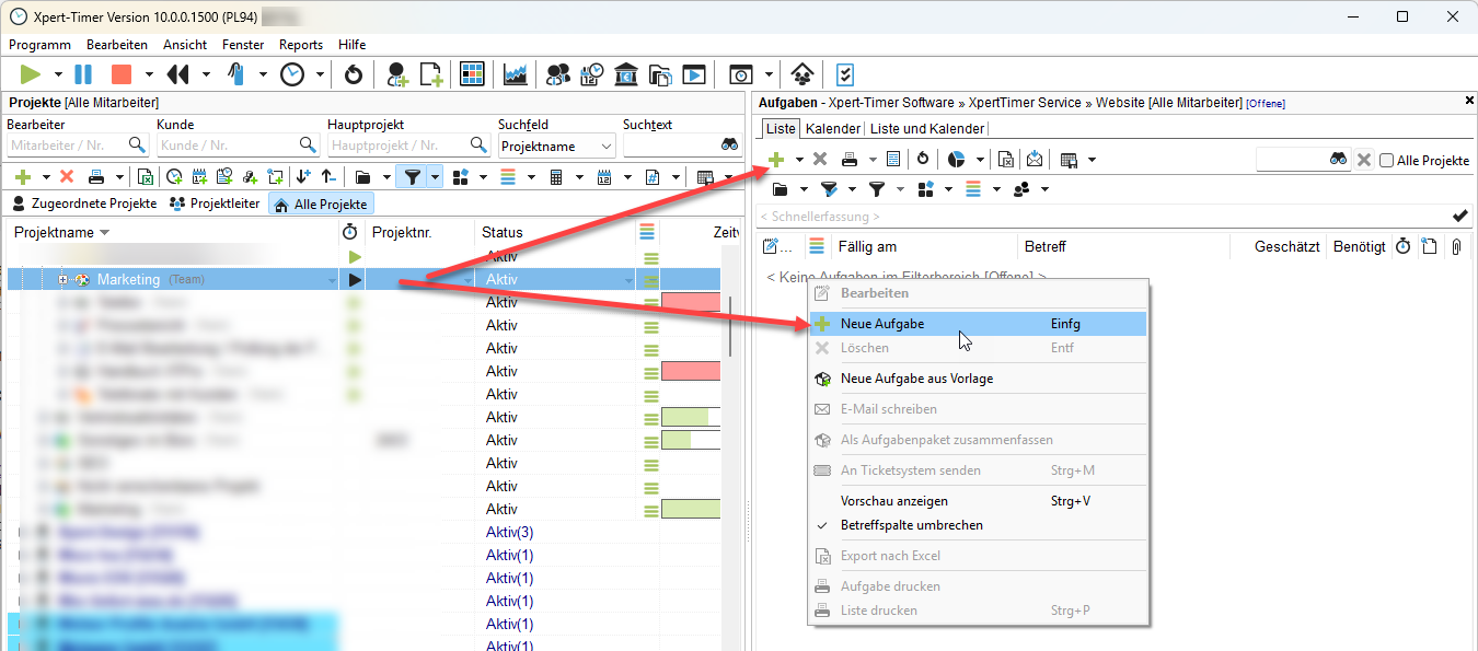 Xpert-Timer versucht immer zu verstehen, für welches Projekt und Mitarbeiter Sie das Projekt anlegen möchten. In unserem Beispiel-Screenshot würden wir bei einem Rechtsklick auf das blau unterlegte Projekt "Handbuch XT Pro" im Projektmanager und die Auswahl "Neue Aufgabe" eine Aufgabe mit Bezug auf das Projekt "Handbuch XT Pro" erstellen.