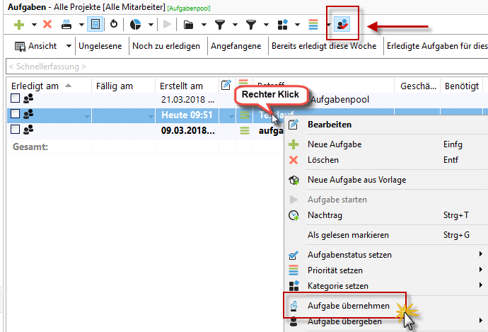 Über den Knopf "Allgemeiner Anzeigenpool" in der Aufgabenliste können Sie sich die öffentlichen Aufgaben anzeigen lassen und per Rechtsklick auf die Aufgabe eine Aufgabe übernehmen.