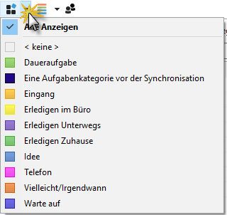In der Filtereinstellung der Kategorien, können Sie Ihre Aufgaben individuell angelegten Kategorien zuweisen. So können Sie sich z.B. im Zug alle Aufgaben mit der Kategorie "Erledigen Unterwegs" anzeigen lassen. Dann sehen Sie nur die Aufgaben, die Sie tatsächlich auch von unterwegs erledigen könnten.