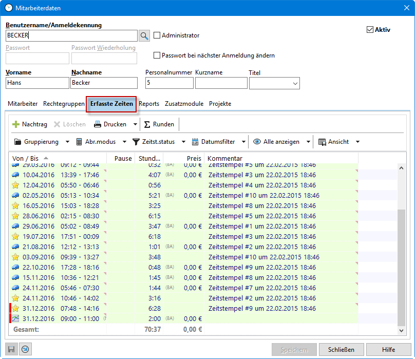 << Click to Display Table of Contents >> Navigation: Xpert-Timer Handbuch > Mitarbeiterverwaltung > Mitarbeiterdaten > Erfasste Zeiten |