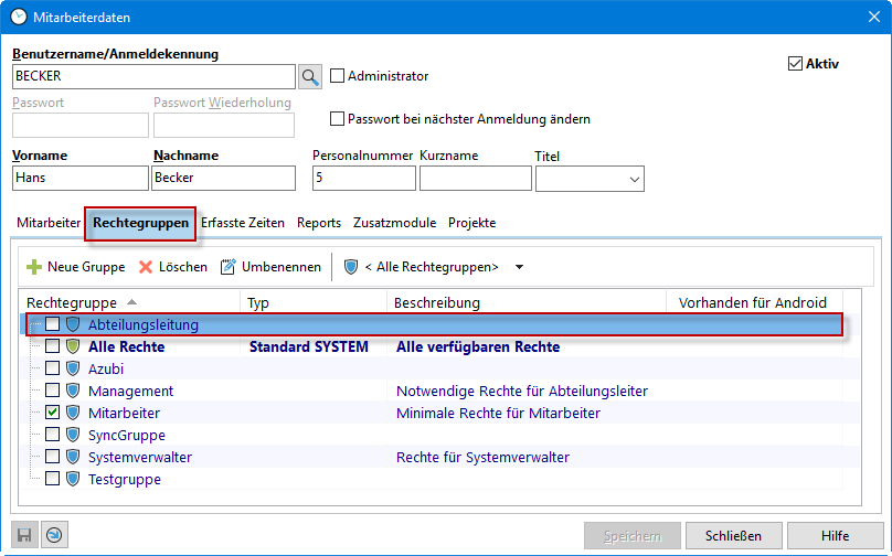 << Click to Display Table of Contents >> Navigation: Xpert-Timer Handbuch > Mitarbeiterverwaltung > Mitarbeiterdaten > Rechtegruppen |