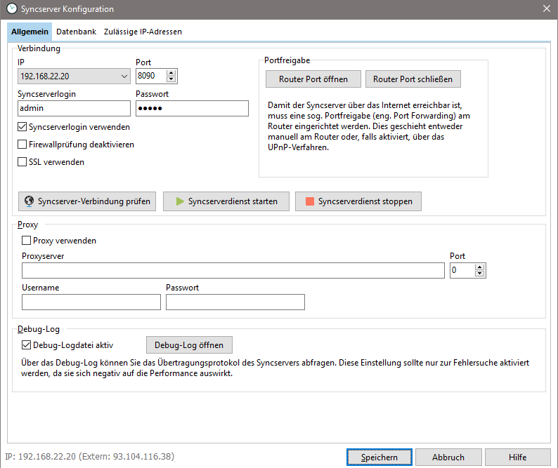 Sollten Sie den Haken bei "SyncServerlogin verwenden" entnehmen, fällt das Einloggen per Benutzernamen und Passwort weg. Dieser Haken sollte aus Sicherheitsgründen immer gesetzt sein. Vergeben Sie ein sicheres Passwort.