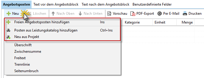 Sie haben die Möglichkeit freie Angebotsposten zu erstellen. Damit können Sie alle Daten zum Posten frei eingeben.