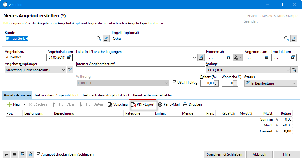 Die weitere Bearbeitung des Angebots finden Sie im Kapitel "Angebot bearbeiten".
