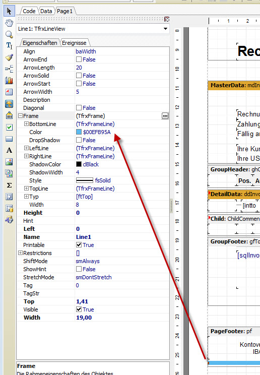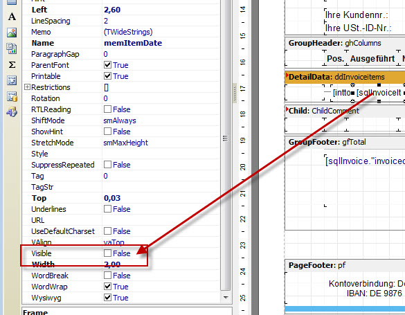 Die Daten selbst, also die SQL Befehle und Datenbänder sollten Sie so bestehen lassen wie sie sind. Wenn Sie ein Feld, z.B. sqlinvoice."discountpercentage" (Rabatt) löschen, erhalten Sie eine Fehlermeldung, da im Reiter "Code" genau dieses Feld noch angesprochen wird. Besser ist es, Sie setzen die Felder die Sie nicht benötigen auf "Visible" -> False. Damit wird dieser Bereich nicht mehr angezeigt. Denken Sie auch daran in allen drei Zeilen den entsprechenden Bereich auf "Visible" -> False zu setzen, damit die Anordnung beim Rechnungsdruck wieder passt.
