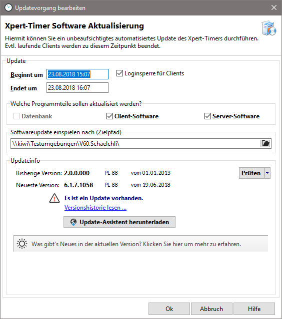 Wählen Sie im ersten Schritt das Datum und die Uhrzeit zu der Sie das Update einspielen möchten. Wählen Sie die Programmteile, die aktualisiert werden sollen sowie die Pfade, wo Sie das Update einspielen möchten.