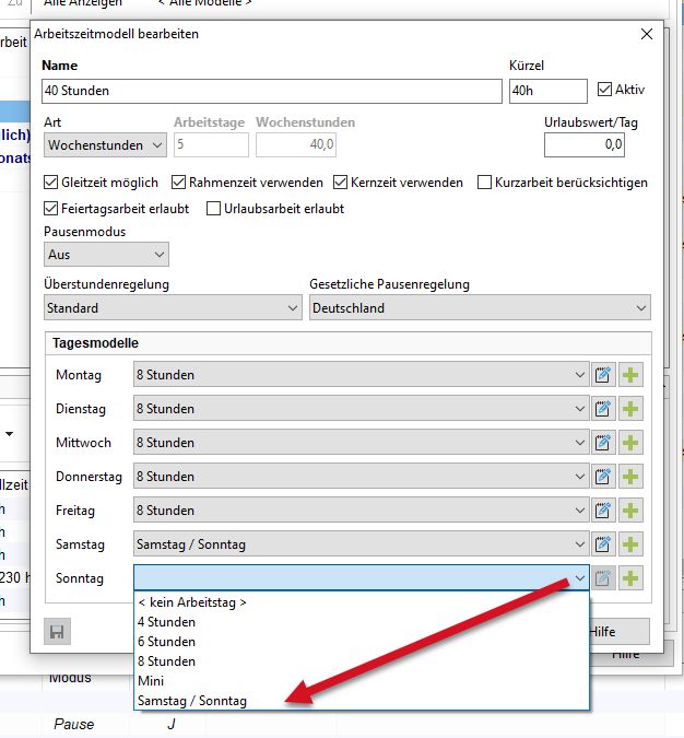 Öffnen Sie dazu Ihr Arbeitszeitmodell, z.B. 40 Stunden, und legen am Samstag über den "Hinzufügen" Knopf ein neues Tagesmodell an.