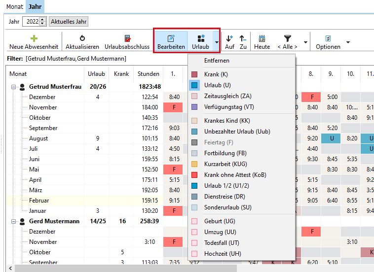 Klicken Sie dann mit der Maus ganz einfach in die Felder des entsprechenden Mitarbeiters und setzen damit die Abwesenheit. Einen längeren Zeitraum können Sie einfacher wie einen Abschnitt weiter oben beschrieben eintragen.
