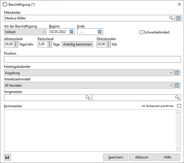 In der Beschäftigung werden die Urlaubstage, die zu verwendenden Feiertage und das Arbeitszeitmodell hinterlegt. Die Angabe eines Vorgesetzten wird später für die Genehmigung der Urlaubsanträge verwendet.