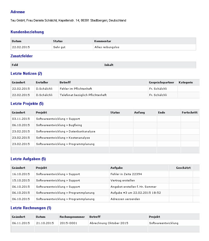 ➢ Adresse ➢ Kundenbeziehung ➢ Zusatzfelder ➢ Die letzten Notizen zum Kunden ➢ Die letzten Projekte, Aufgaben, Angebote und Rechnungen ➢ Die offenen Projekte, Aufgaben, Angebote und Rechnungen |