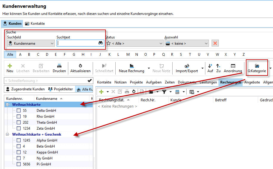 Über die Gruppierungsfunktion und der Auswahl "Kategorie" oder über die Suchfunktion können Sie dann entsprechende Kunden mit der gewählten Kategorie anzeigen.