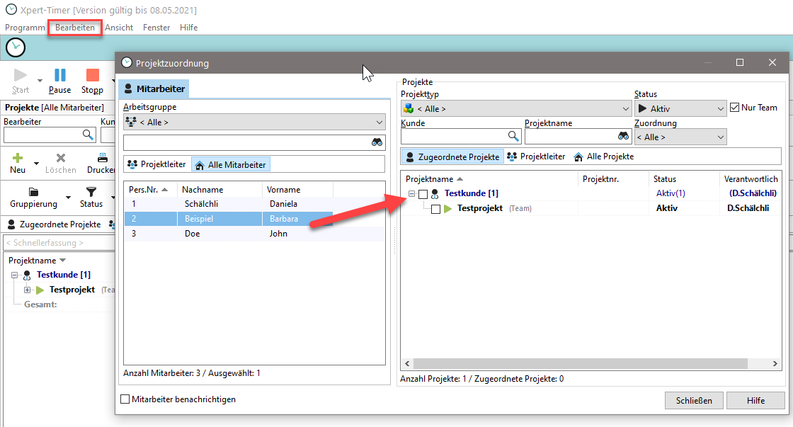 Über den Menüpunkt "Bearbeiten" können die Projekte den anderen Mitarbeitern zugeordnet werden. Die Mitarbeiter können mit der Maus mehrfach markiert werden, so dass mehreren Mitarbeitern auf einmal bestimmte Projekte zugeordnet werden können.