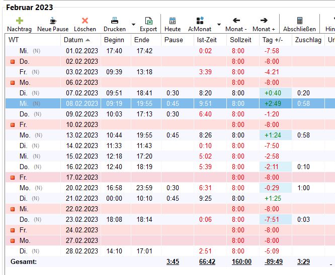 Nach dem Einlesen der Projektzeiten, werden damit alle Arbeitstage gefüllt die auch in der Projektzeiterfassung erfasst wurden. Tage ohne Zeiten werden rot markiert und sollten geprüft werden.