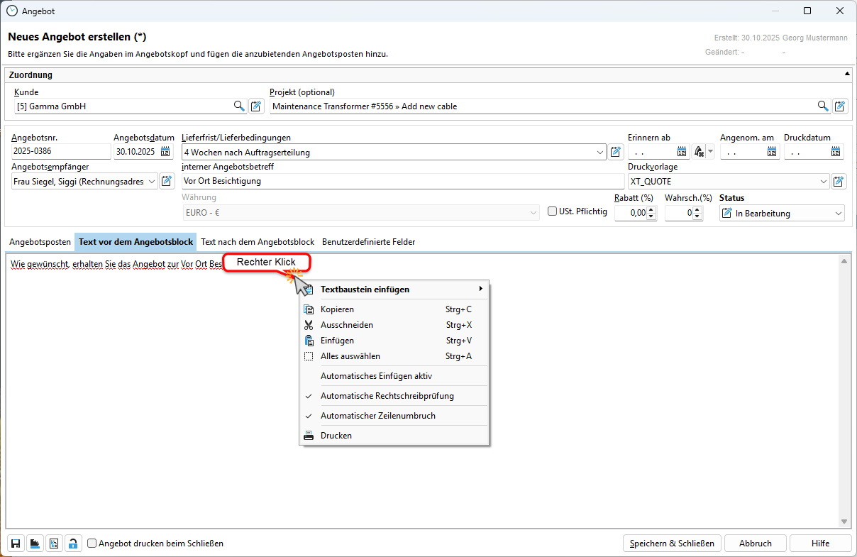 Auf Ihrem Angebot können Sie vor der Auflistung Ihrer Angebotspositionen noch einen freien Text pro Angebot einfügen. Hier können Sie auch von Ihnen definierte Textbausteine nutzen.