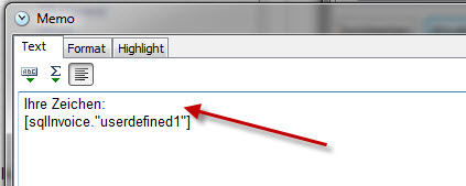 Im nächsten Schritt legen Sie jetzt im Reiter "Page 1" ein Textfeld ein, indem Sie auf den Textfeld Marker klicken. Dann klicken Sie nochmals an die Stelle in Ihrem Report, an der Sie das benutzerdefinierte Feld darstellen möchten. Doppelklicken Sie das Feld, damit Sie Daten eingeben können und geben Sie [sqlInvoice."userdefined1"] ein. Das können Sie natürlich mit allen Feldern von 1 - 9 machen. Drücken Sie F9 um Ihre Anpassung zu prüfen.
