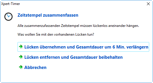 Auch wenn die einzelnen Stempelungen Lücken aufweisen, können Sie diese zusammenfassen. Sie werden dann gefragt, ob Sie die Lücken übernehmen möchten und dafür die Dauer des Projekts verlängern möchten oder ob Sie die Lücke entfernen möchten und damit aber auch gleichzeitig die Dauer der Arbeitszeit am Projekt verlängern.