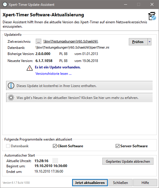 Wählen Sie im ersten Schritt das Datum und die Uhrzeit zu der Sie das Update einspielen möchten. Wählen Sie die Programmteile, die aktualisiert werden sollen sowie die Pfade, wo Sie das Update einspielen möchten. Bitte beachten Sie, dass die Pfade keine Leerschritte enthalten dürfen.