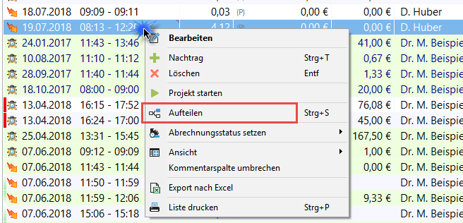 Per Rechtsklick auf einen Zeitstempel können Sie diesen aufteilen. Das ist besonders komfortabel, wenn man vergessen hat zwischen den Projekten umzuschalten.