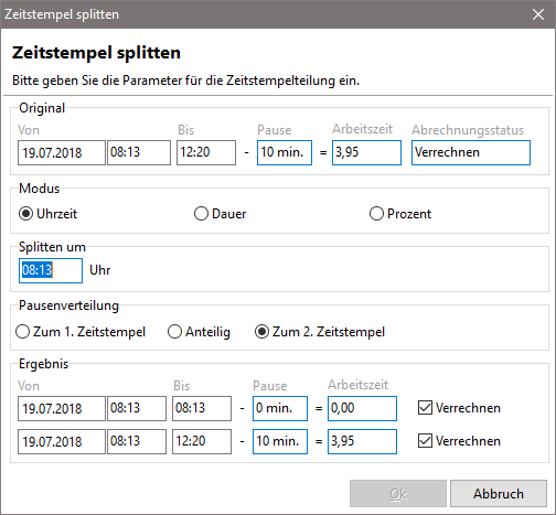 << Click to Display Table of Contents >> Navigation: Xpert-Timer Handbuch > Projekte > Projektmanager - Bereiche > Die Zeitstempelliste > Zeitstempel aufteilen |